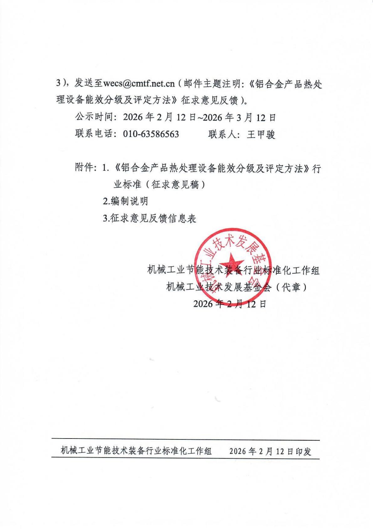 根据《工业和信息化部行业标准制定管理办法》要求的标准制定程序,机械工业技术发展基金会(机械工业节能与资源利用中心)牵头制定的行业标准《铝合金产品热处理设备能效分级及评定方法》(计划号:2025-0030T-JB)已完成征求意见稿和编制说明(见附件1、2)。