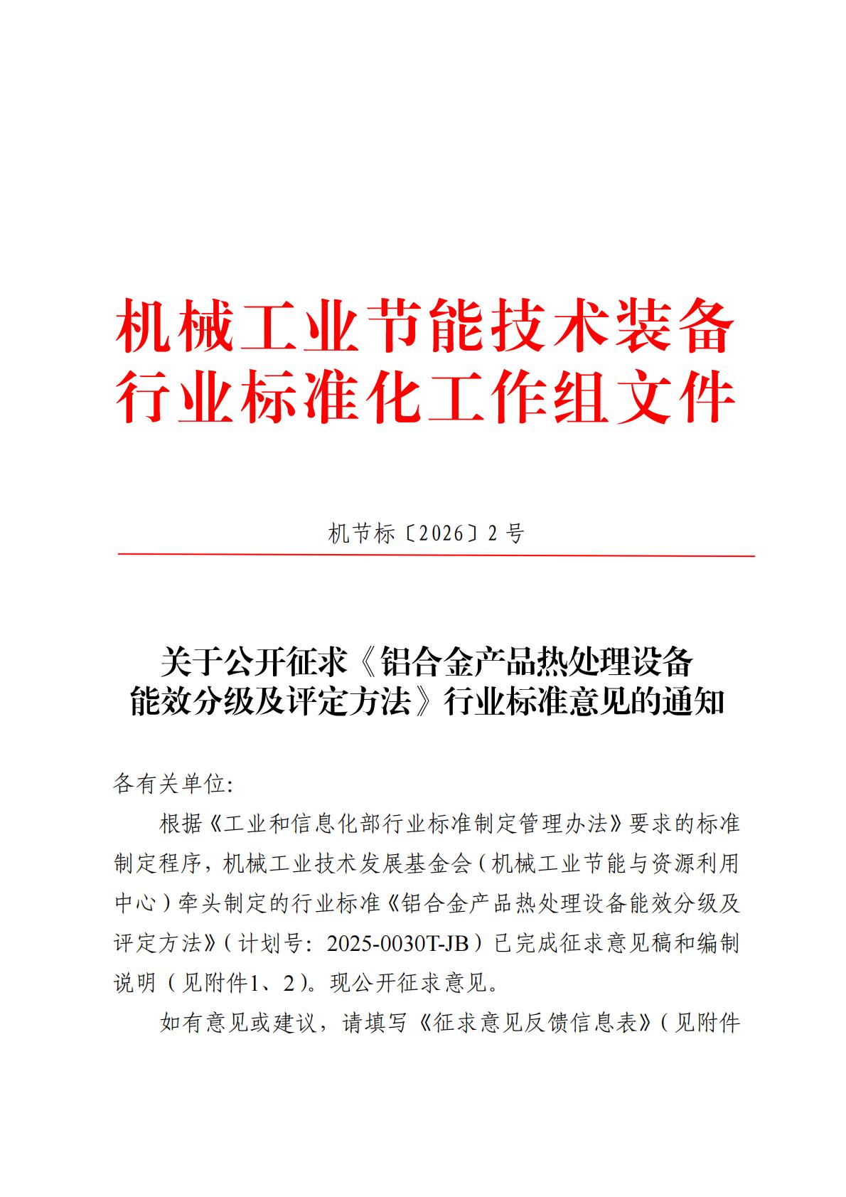 根据《工业和信息化部行业标准制定管理办法》要求的标准制定程序,机械工业技术发展基金会(机械工业节能与资源利用中心)牵头制定的行业标准《铝合金产品热处理设备能效分级及评定方法》(计划号:2025-0030T-JB)已完成征求意见稿和编制说明(见附件1、2)。